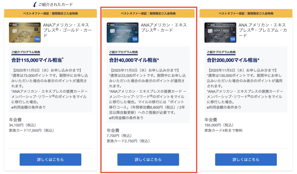 紹介プログラム専用サイト内の「その他のカードはこちら」をクリックすると、ANAアメックスを選択することができます。