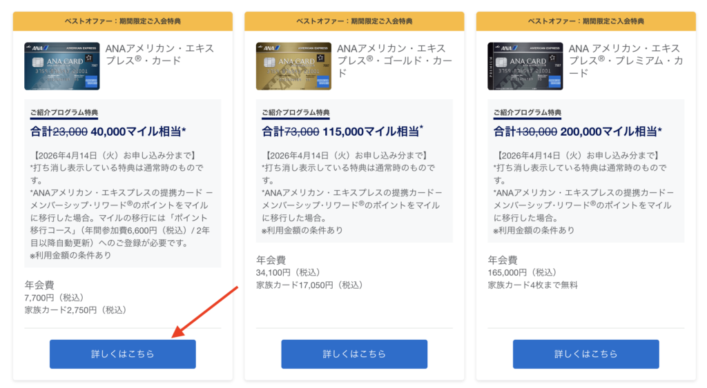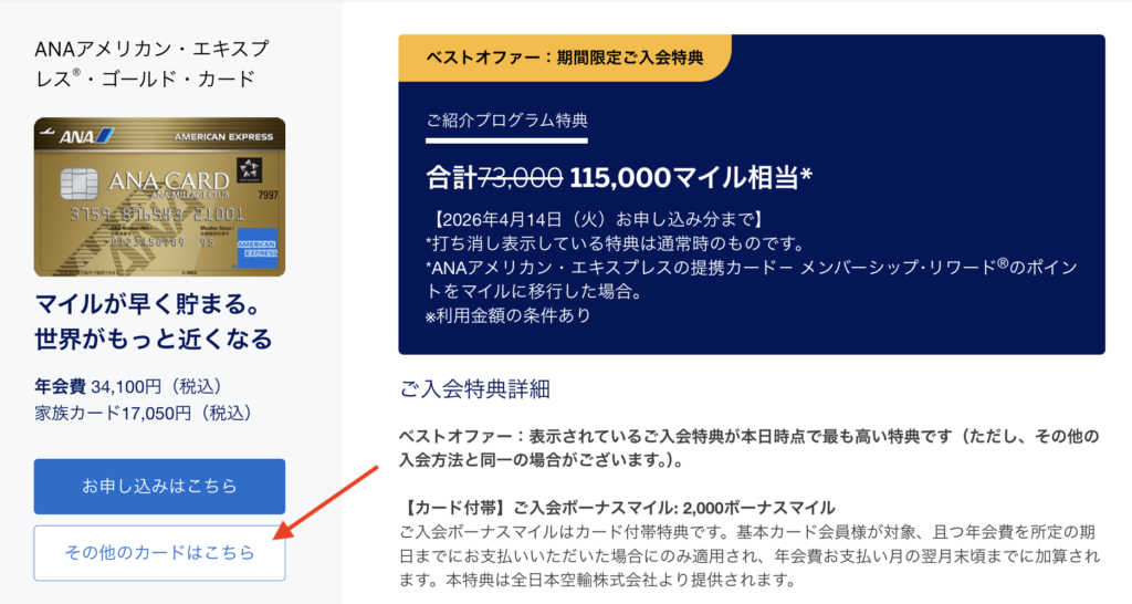 紹介プログラム専用サイト内の「その他のカードはこちら」をクリックすると、ANAアメックスを選択することができます。